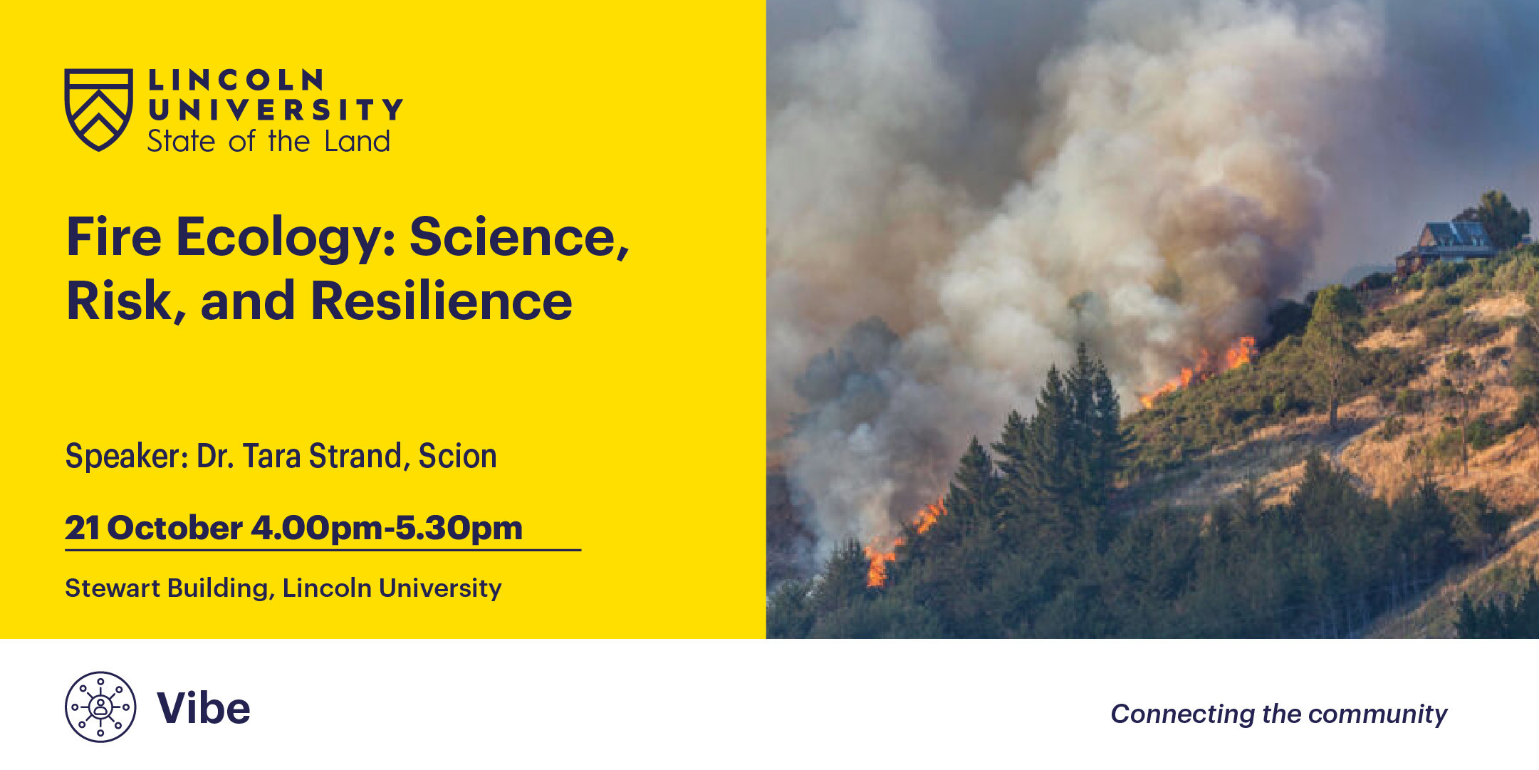 In this Vibe session, Tara will share the latest thinking on how fire interacts with our landscapes, the challenges and opportunities for managing fire in New Zealand, and what we can learn from international research. She’ll also explore how communities and land managers can adapt to a future where fire is an ever-present part of our ecology.